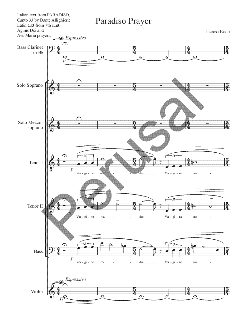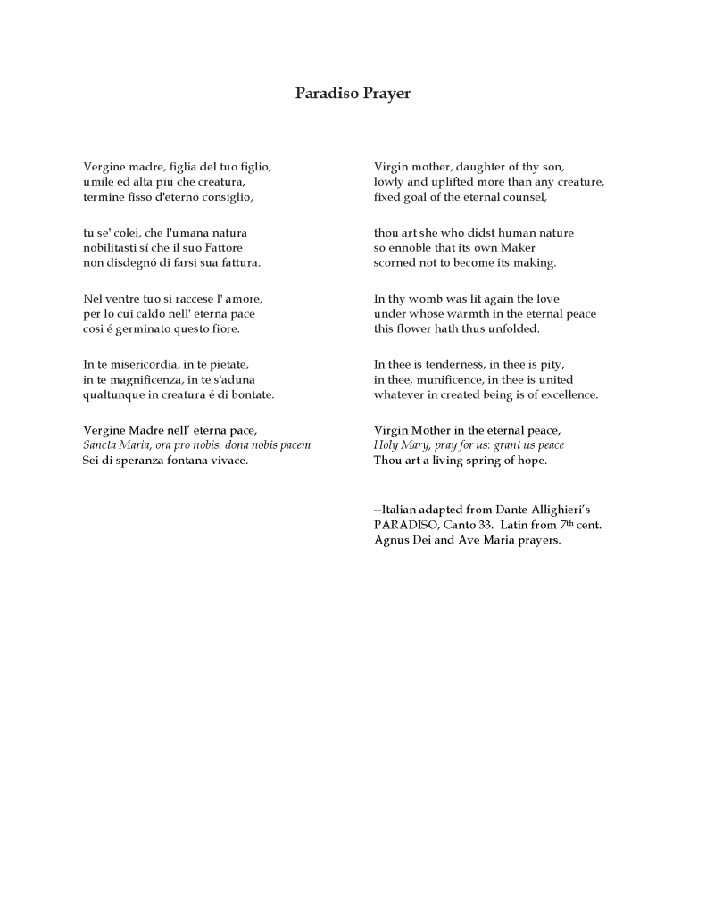 The text for Paradiso Prayer is borrowed from Dante’s Prayer to Mother Mary from Canto 33 of Paradiso in his Divine Comedy. Five verses in this elegant prayer describe aspects of the Divine Feminine that are attributed to Mary. These eloquent verses gradually point to two qualities that seem to be most needed during our current time: peace and hope. I was working on the composition in early 2022 when Russia declared war on Ukraine. At that point, I decided to adapt the excerpted passage in order to reinforce its timely message. Begging Dante’s indulgence, I took the liberty of inserting phrases borrowed from two familiar Latin prayers to Mary–the Ave Maria and the Angelus—between the lines of the fifth verse of Canto 33. The newly adapted lyrics end with these words, translated here: