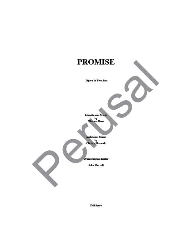 PROMISE – Perusal Libretto & Full Score Synopsis Production Specifications Reviews PROMISEHome Libretto& Score Recordings Purchase Table of contents is found after page 76 of the libretto. Click to turn pages. LIBRETTO AND MUSIC BY THERESA KOON ADDITIONAL MUSIC BY CHRISTY SLOVACEK DRAMATURGY EDITOR JOHN MURRELL Like Loading...