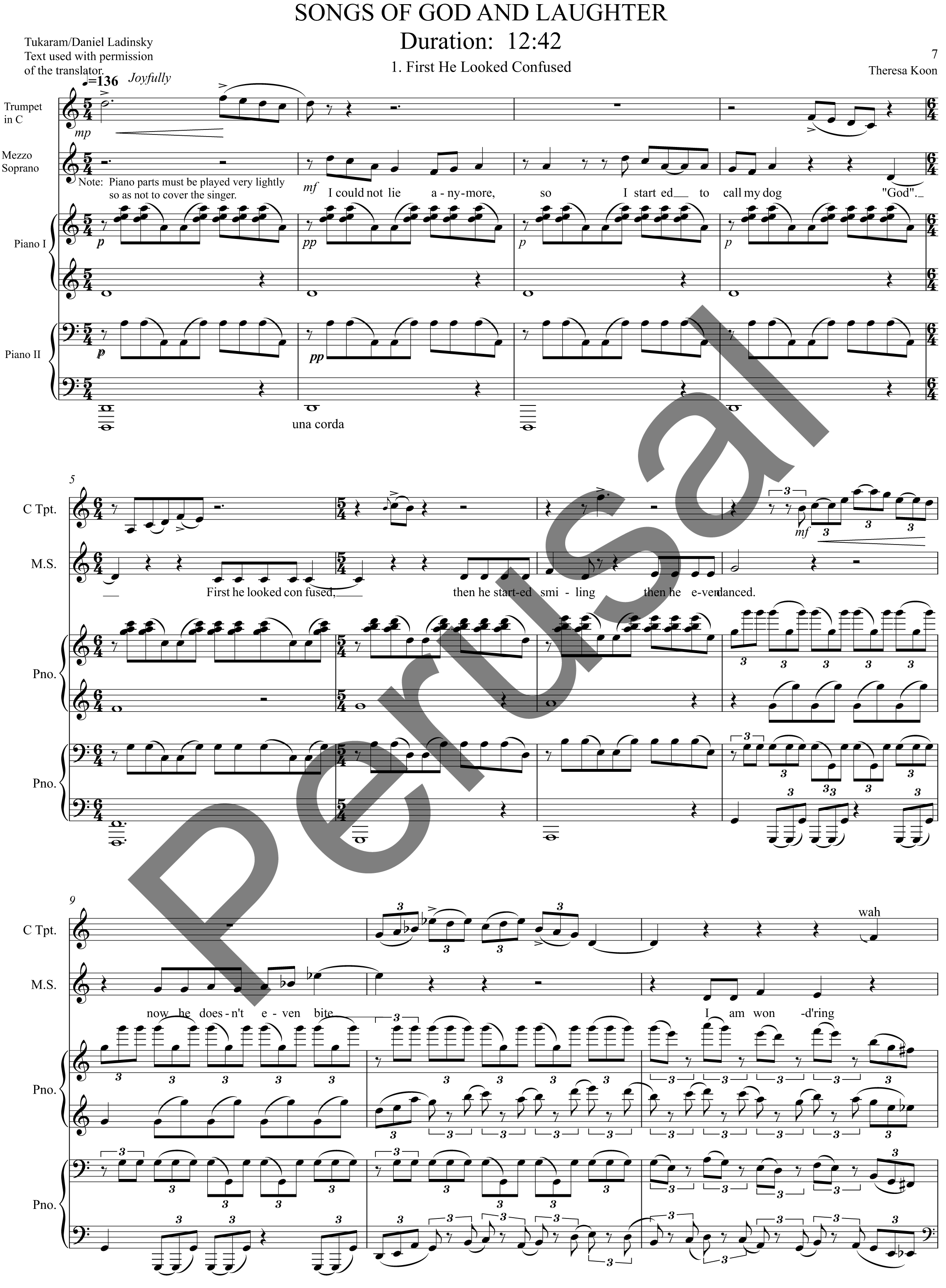 A cycle of six songs for Mezzo-soprano and/or Baritone with Trumpet and Piano/4 Hands. These solo works are also included in the larger cycle for choir entitled WHERE EVERYTHING IS MUSIC. The humor, compassion and transcendence expressed by these Muslim poets is the inspiration behind this set, which is intended as a gesture of ecumenism for both sacred and secular concert events.