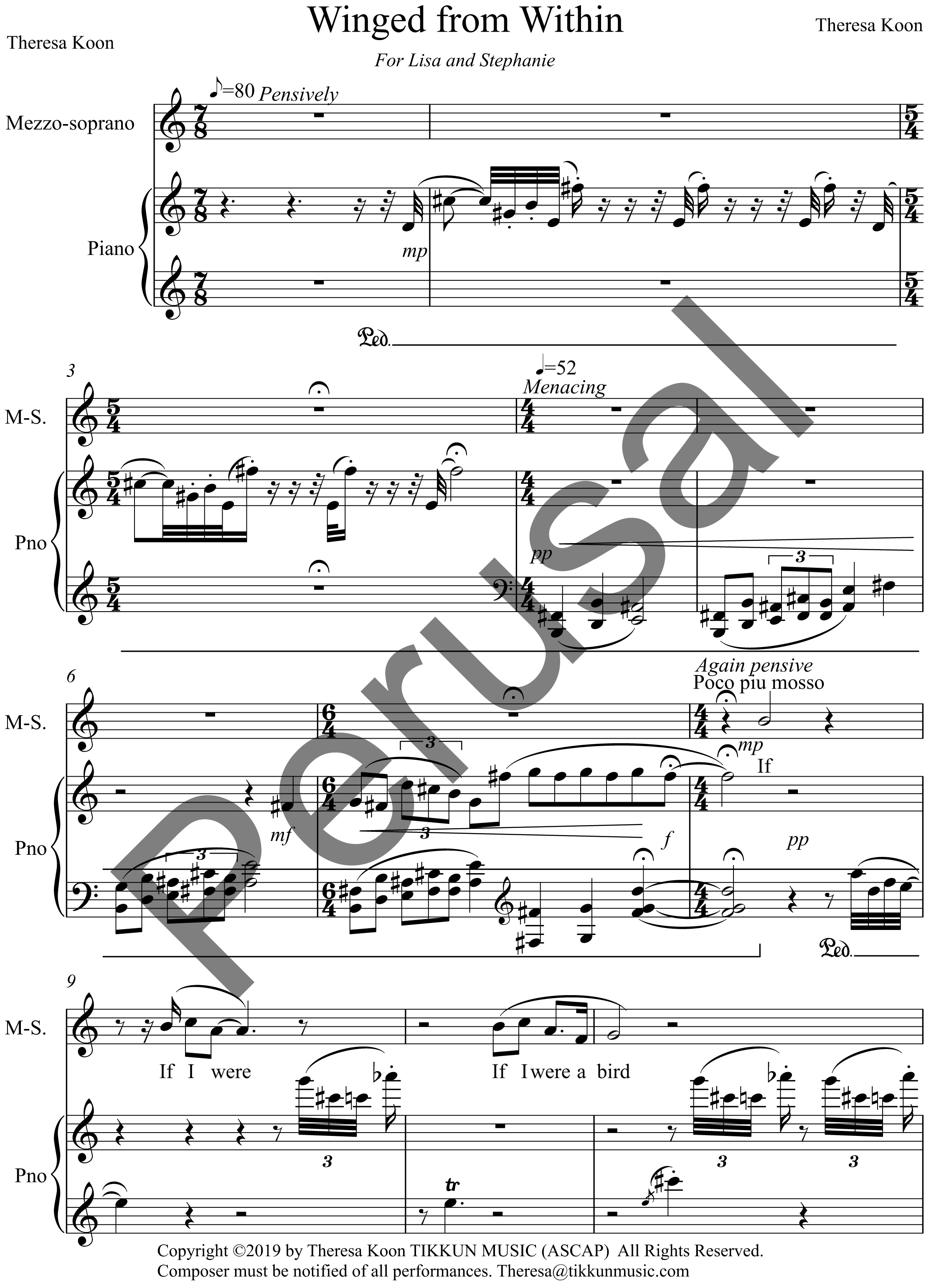 Mezzo-soprano Lisa Neher and Pianist Stephanie Thompson commissioned Winged from Within for their wonderful concert tour entitled “If I Were a Bird…”, which echoes the first phrase of the song. The text contemplates the joys, terrors and epiphanies of existence from a bird’ point of view. Duration: 4:15