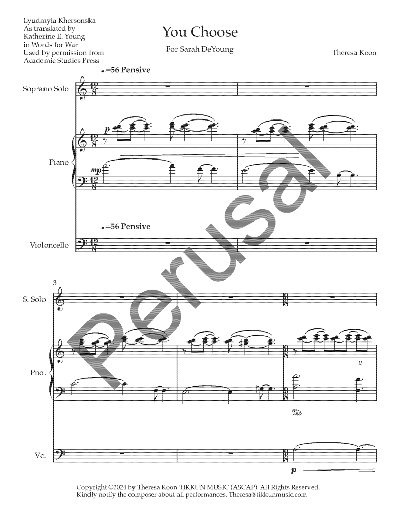 This is a setting of a poem by Russian poet Lyudmyla Khersonska, as translated by Katherine E. Young in Words for War, which refers to the current Ukrainian conflict. Soprano Sarah DeYoung, Pianist Paul Floyd and Cellist Julian Casas performed this World Premiere at a concert at Portland State University in 2024. Ms. DeYoung commissioned this work. Duration: 6:00